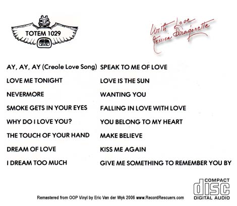 New to JessicaDragonette.com! On "With Love," Jessica Dragonette performs wonderful classics taken from her broadcast transcriptions. Out of print for years, this album has just been remastered to CD. Click on a link to listen to a sample with RealAudio All samples are encoded for dialup users. |